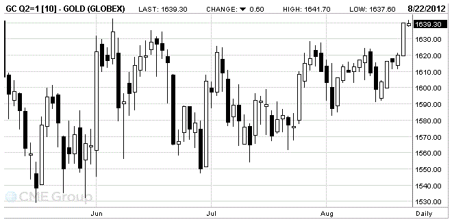 The cost of the August gold futures on the COMEX is now 1639.3 dollars per ounce.