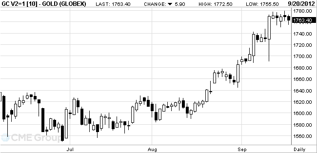 October futures price of gold on the COMEX is now 1763.4 dollars per ounce.