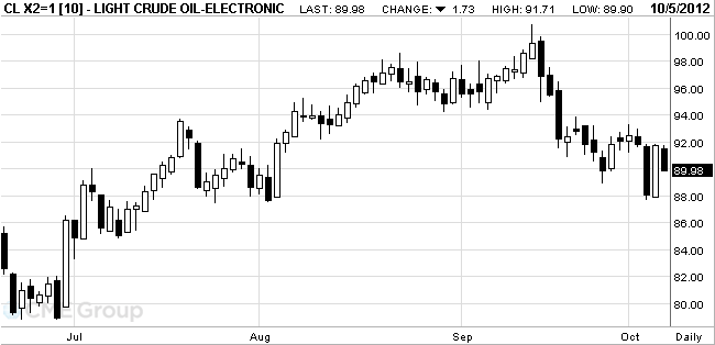 Crude oil for November delivery fell to $89.90 a barrel on the New York Mercantile Exchange. Prices are down 2 percent this week.