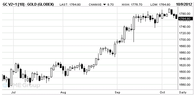 October futures price of gold on COMEX has fallen today to 8.7$ and is now 1764.8 dollars per ounce.