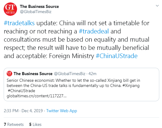 China's Foreign Ministry: "China will not set a timetable for reaching or not reaching a trade deal and consultations must be based on equality and mutual respect," - Global Times