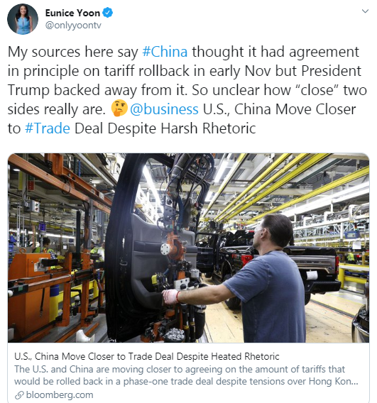 CNBC's Beijing correspondent Yoon: "My sources here say China thought it had agreement in principle on tariff rollback in early November but President Trump backed away from it. So unclear how close two sides really are"