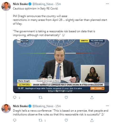 • Italy's PM Draghi: Italy will ease restrictions in many areas from April 26 - BBC сorrespondent