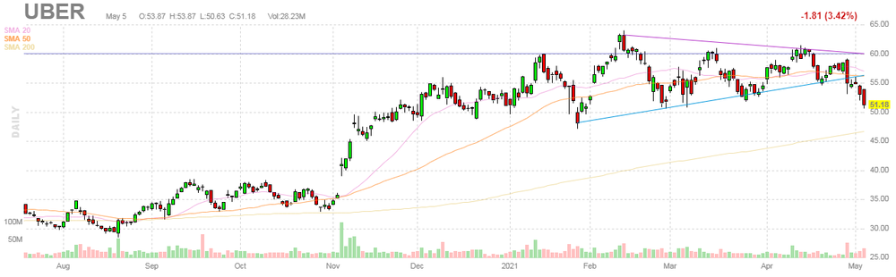 UBER fell to $49.30 (-3.67%) in pre-market trading.