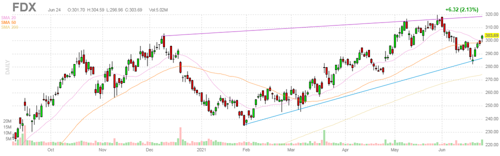 FDX fell to $291.56 (-3.76%) in pre-market trading.