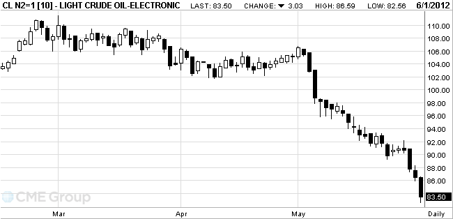 Crude futures for July delivery declined to $82.56, the lowest intraday level since Oct. 7 on the New York Mercantile