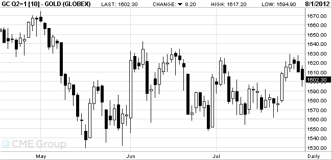 The cost of the August gold futures on the COMEX today fell to 1594.9 dollars per ounce.