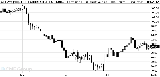 Crude oil for September delivery rose to $89.20 a barrel on the New York Mercantile Exchange. Futures traded at $88.63 a barrel before release of the inventory report. Prices gained 3.6 percent last month and are down 11 percent this year.