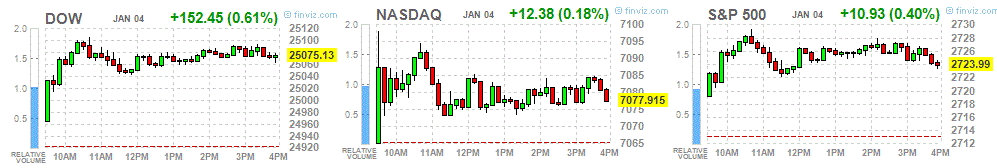 The major US stock indexes finished trading in positive territory, with the Dow Jones industrial index for the first time exceeding 25,000, while other indices updated highs after strong US employment data added optimistic sentiments for sustainable growth worldwide.