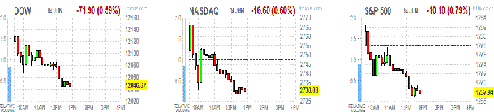 Industrial, commodity and financial shares had the biggest losses among 10 groups in the S&P 500. The Morgan Stanley Cyclical Index of companies most-tied to the economy slid 1.5 percent. Caterpillar (САТ), the largest maker of construction and mining equipment, dropped 2 percent to $83.83. JPMorgan (JPM) fell 2 percent to $31.28.