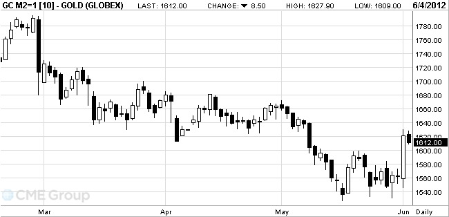 The official price of gold on the Commodity Exchange in New York COMEX trading Friday on the results of June 1, 2012 increased by 3.7% for the first time since the beginning of May 2012 established above 1600 USD/oz. Troy ounce of gold on COMEX has risen to 57.9 dollars, while the official price of its active futures (August) amounted to 1622.1 dollars / ounce - the highest figure since May 4 this year