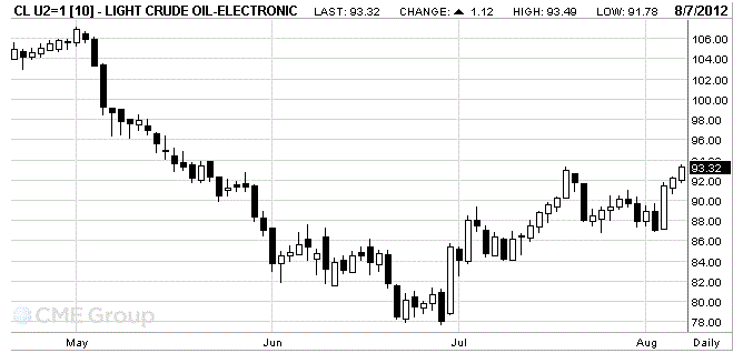 The cost of the September futures on U.S. light crude oil WTI (Light Sweet Crude Oil) on the NYMEX rose to a high of $93,28 per barrel.