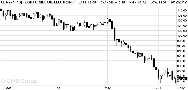 Oil for July delivery gained to $83.72 a barrel on the New York Mercantile Exchange after dropping to $81.07, the lowest intraday level since Oct. 6. Prices are down 15 percent this year.