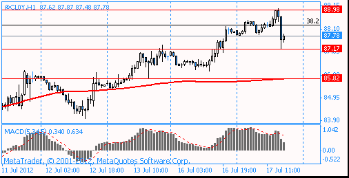 Crude for August delivery rose to $89.28 a barrel on the New York Mercantile Exchange after rising to $89.28 and falling to $87.41. Prices have declined 10 percent this year.