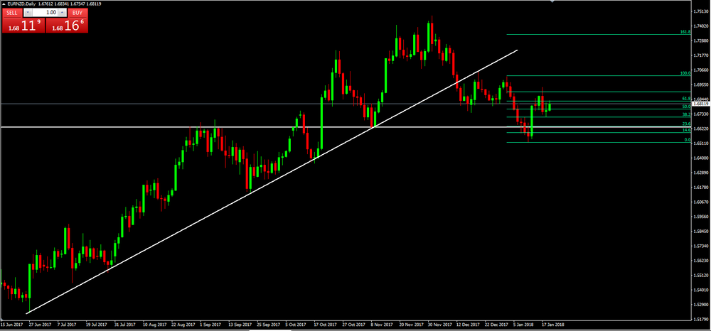 On daily time frame chart, we can see that EUR/NZD has broken an important upside trend line and since the breakout it starts a new bearish movement.