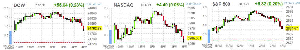 Stock-market indexes closed marginally lower on Wednesday, with the Dow and S&P 500 retreating from record levels for a second session, as congressional Republicans sent tax-cut legislation to President Donald Trump for his signature. The small declines by major indexes belied bullish market breadth, however. Exchange data showed advancers outnumbered decliners on the NYSE and Nasdaq.