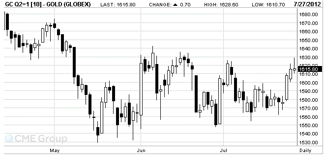 The U.S. economy expanded 1.5 percent in the second quarter, slower than the 2 percent gain in the first three months of the year, as a softening job market prompted Americans to curb spending, Commerce Department figures showed today. The median forecast of economists surveyed by Bloomberg News was a 1.4 percent increase. Yesterday, European Central Bank President Mario Draghi said policy makers will do whatever is needed to save the euro. Gold is headed for the biggest weekly rally in two months.