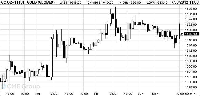The cost of the August gold futures on the COMEX is trading today in the range of 1613.1 - 1625.8 dollars per ounce.