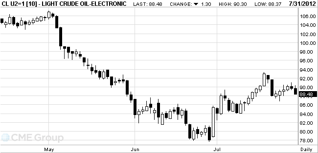 Oil for September delivery fell 97 cents, or 1.1 percent, to $88.81 a barrel at 11:01 a.m. on the New York Mercantile Exchange. Prices have climbed 4.5 percent this month and have declined 10 percent this year. Earlier, futures touched $88.37.
