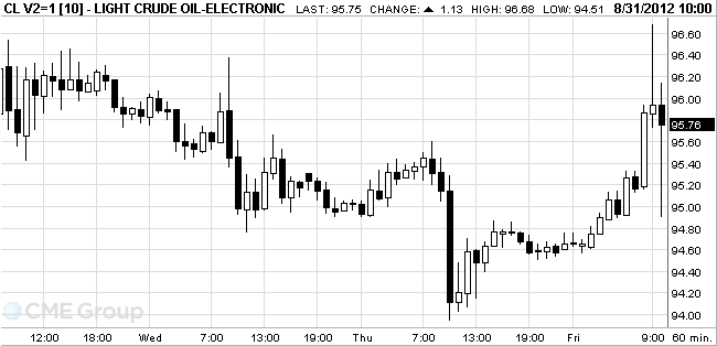 Oil for October delivery increased $1.23, or 1.3 percent, to $95.85 a barrel at 10:20 a.m. on the New York Mercantile Exchange. Prices are down 0.3 percent this week and 8.8 percent this month. Futures touched $96.68 before Bernanke’s speech.