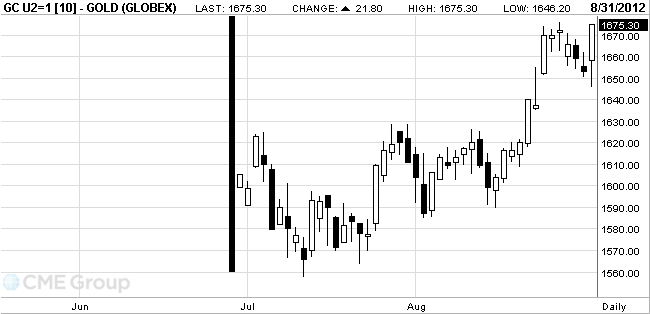 September futures price of gold on the COMEX is now 1675.30 an ounce.