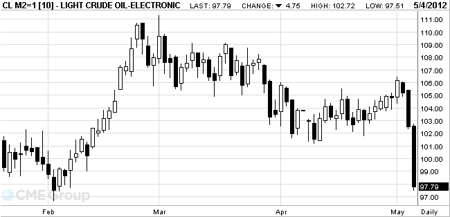 Crude oil for June delivery dropped to $97.51, the lowest level since Feb. 10. Prices are down 6.3 percent this week, heading for the biggest weekly decline since September.