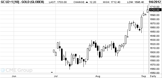 September futures price of gold on COMEX rose to 1712.14 dollars an ounce and is now 1703.00 an ounce.