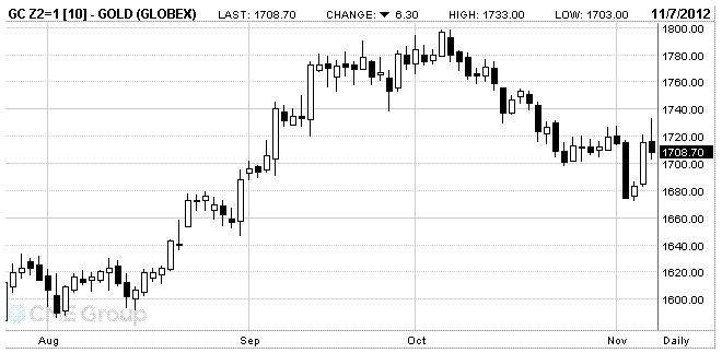 December futures price of gold on COMEX today fell to 1709.40 dollars per ounce.