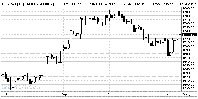 Recall that gold has risen in price this week on speculation that U.S. policy will add more stimulus after President Barack Obama won the presidential election, as well as fears that the current situation in Greece can not meet the requirements for the provision of assistance. We also learned that the gold assets in exchange-traded products reached 2,596.1 tons yesterday. At the same time, analysts say that the demand for gold in India, the largest consumer of the precious metal, could rise by as much as 15 percent in the quarter, against the season of festivals, which stimulates the sale of jewelry.