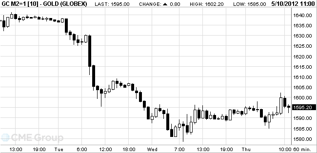 The cost of the June gold futures on the COMEX fell today to $ 1585.0 an ounce, then rose to $ 1602.2 and is now trading at $ 1595.2 an ounce.