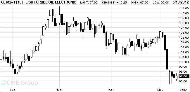 Crude for June delivery gained to $97.69 a barrel on the New York Mercantile Exchange. The price slumped 8.8 percent in the six-day losing streak.