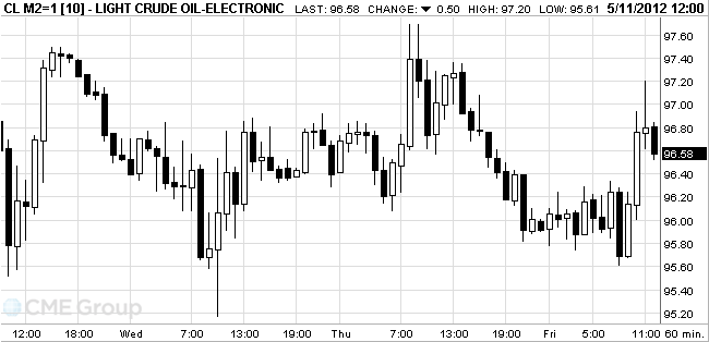Crude oil for June delivery dropped to $95.61 earlier. The contract is 1.4 percent lower this week.