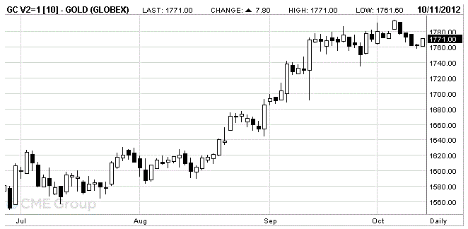 October futures price of gold on the COMEX fell 7.3$ today and now is 1770.50 an ounce.