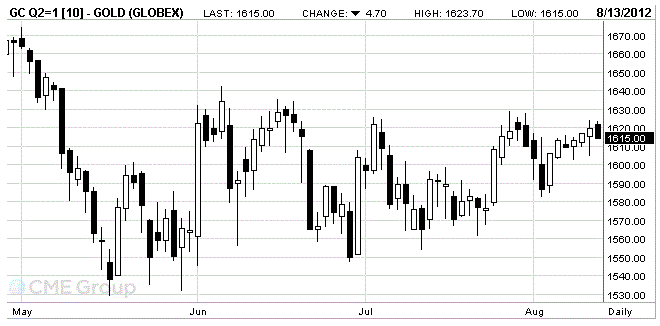 The cost of the August gold futures on the COMEX today, high of 1623.7 dollars per ounce, and then declined and is now trading at around 1615.0 dollars per ounce.