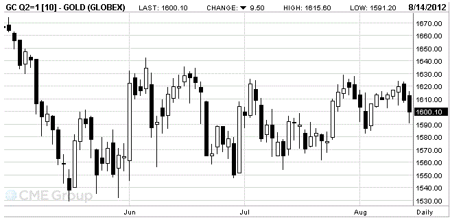 The cost of the August gold futures on the COMEX today reached a low of 1591.2 dollars per ounce, and then increased slightly and is now trading at around 1600.1 dollars per ounce.