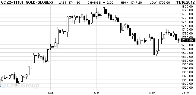 The price of gold down amid falling stocks and of the dollar, as investors prefer the U.S. dollar, which is considered a safe haven, after militants from the Hamas sent rockets into strontium Jerusalem. Geopolitics roost trading recently. The shelling of the city's historic raised fears of war in the region.