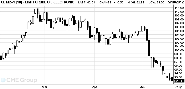 Crude oil for June delivery fell to $91.60 a barrel, the lowest level since Nov.3 on the New York Mercantile Exchange. Prices have retreated 4.3 percent so far this week.
