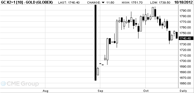 China’s industrial production, retail sales and fixed-asset investment accelerated in September after a seven-quarter slowdown. European Union leaders are meeting in Brussels for two days starting today. Gold surged 11 percent in the last quarter after the U.S., Japan and the European Central Bank enacted measures to stimulate growth, increasing demand for the precious metal as an inflation hedge.