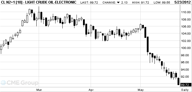 Crude oil for July delivery fell to $89.55 a barrel, the lowest level since Nov. 1, on the New York Mercantile Exchange.
