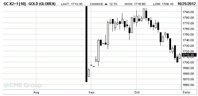 November futures price of gold on COMEX today rose by $12.7 and now is $1713.30 an ounce.