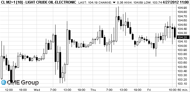 Crude oil for June delivery dropped to $104.14 a barrel on the New York Mercantile Exchange. Futures are up 1.2 percent this week and have increased 5.5 percent this year.