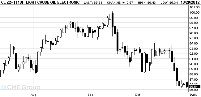 Futures dropped as much as 1.1 percent and the motor fuel rose as much as 2.8 percent as Sandy strengthened. The storm will probably make landfall tomorrow, according to a National Hurricane Center advisory. Phillips 66 (PSX), NuStar (NS) Energy LP, Hess Corp. (HES) and PBF Energy Inc. said they are shutting or reducing output at New Jersey refineries and terminals as a precaution.