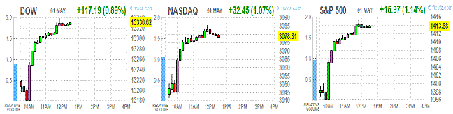Stocks extended gains today after U.S. data showed manufacturing in the world’s largest economy expanded in April, driven by gains in orders and production. The Institute for Supply Management’s factory index climbed to 54.8, exceeding the most optimistic forecast, from 53.4 in March. Readings greater than 50 signal growth.