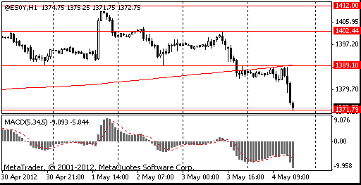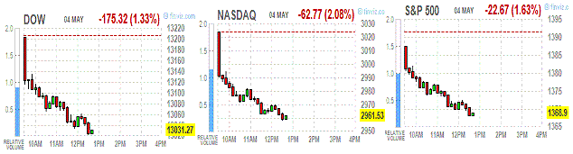 Equities fell today as service industries grew at a slower pace than projected in April, a sign the largest part of the economy may struggle to accelerate. The report overshadowed data showing that jobless claims fell to 365,000 in the week ended April 28, a one-month low. The Labor Department may say tomorrow that the U.S. added 160,000 jobs in April, compared with a gain of 120,000 the previous month.