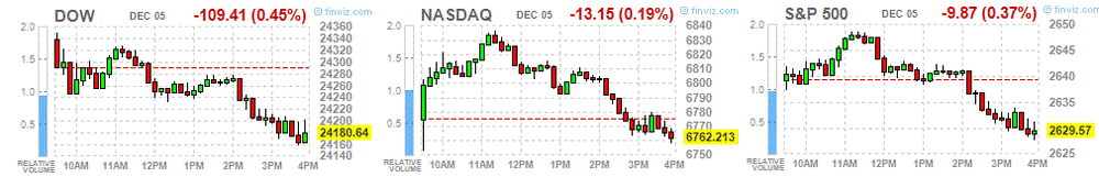 Major US stock indexes finished trading in negative territory amid a decline in almost all sectors and publication of weak statistical data for the United States. In addition, investors assessed the changes to the Senate tax reform bill, which could affect the ability of companies to reduce their tax costs.