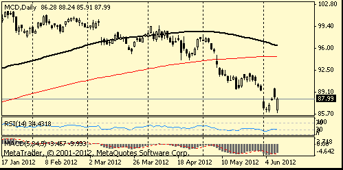 McDonald’s (MCD) dropped 1 percent to $87.50. Sales at stores open at least 13 months rose 3.3 percent globally last month, falling short of analysts’ estimates, as sales declined in Japan and China. Analysts projected a gain of 5.2 percent, the average of 13 estimates compiled by Consensus Metrix.