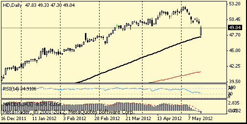 Home Depot (HD) slumped 2.3 percent to $48.76. Warmer-than- normal temperatures accelerated sales of outdoor items, raising concern that second-quarter sales would slow. Same-store sales decelerated during the course of the first quarter, rising 5.4 percent in April after advancing 6 percent in March and 6.2 percent in February, Chief Financial Officer Carol Tome told analysts today.