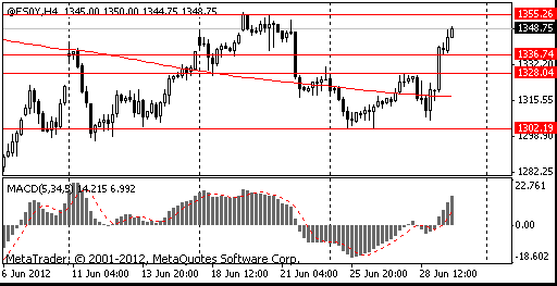 As part of DOW index, all but one of the company show a positive trend. The leaders of the growth of United Technologies Corp. (UTX, +3.77%), Boeing Co. (BA, +3.24%), Bank of America Corporation (BAC, 3.10%), Hewlett-Packard Company (HPQ, 2.87%). Reducing the company's stock show only JPMorgan Chase & Co. (JPM, -0,53%).