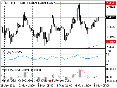 US data also comes at 1230GMT, when initial jobless claims are  expected to fall 19,000 to 410,000 in the April 30 week after rising sharply in the previous week. At the same time, non-farm productivity is expected to slow to a 1.5% increase in the first quarter, as GDP growth was much slower than in the previous quarter. Unit labor costs are expected to rebound 0.8% as a result. At 1330GMT, Fed Chairman Ben Bernanke delivers a speech to the Chicago Fed's Annual Conference on Bank Structure and Competition.