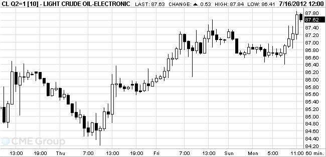 Oil for August delivery traded at range of $86,41 - $87,84 on the New York Mercantile Exchange. The contract rose 1.2 percent to $87.10 on July 13, the highest close since July 5. Prices have fallen 11 percent this year.